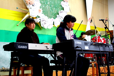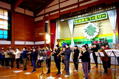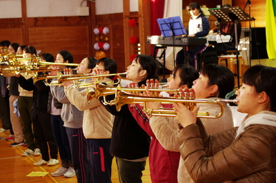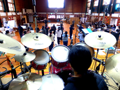 2月24日の1コマ:バンドメンバーは1日、お父さんに見てもらいながら、コンサートの曲目を合わせ、演奏を調整していきました。