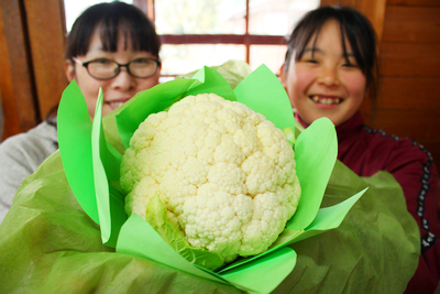 3月1日の1コマ:今季はじめての、カリフラワーの収穫をしました! 今日の1コマ 2022年3月1日 〈崖崩れハウス前下畑で育てているカリフラワーの、最初のひとつが収穫できました。畑で葉にくるまれていたときと同じようにラッピングをした、記念すべきこのカリフラワーは、担当の子たちから、お父さんお母さんへプレゼントされました〉 ◀︎ホームページへ戻る