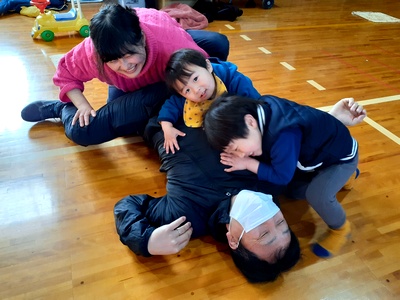 たけちゃんとちーちが2人がかりでのし掛かり、ひでゆきさんの上半身を、しっかりホールド。これはかなり効くのでは…?