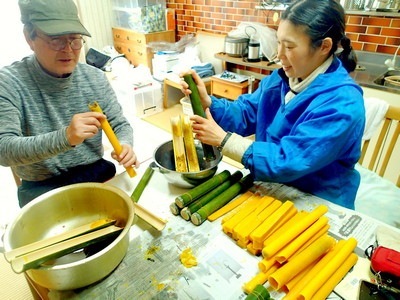 今日は、前回巣クズから取り出した蜜蝋の塊を、持ちやすく、巣箱に塗りやすい型に作り直す方法を、藤井さんに教えていただきました。