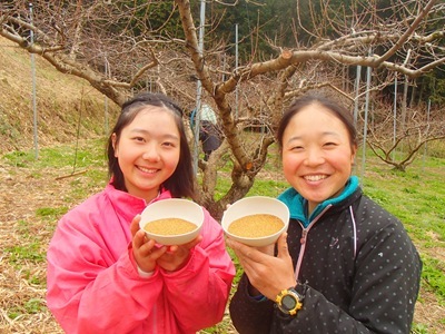 5月8日の1コマ その2:桃のネットがけ2日目! 2日間で、全ての桃の木にネットをかけることができました! 今日の1コマ 2025年5月8日 〈桃のネットがけ2日目! 昨日は開墾17a、26aの桃畑のネット掛けが終わり、今日は山の桃畑からスタートです!〉 〈1日目を踏まえて、今日は新たな作戦です! 昨日までは、大ネットをかけるチームと小ネットをかけるチームに分けて進めましたが、今日は5人1チーム制にし、脚立部隊2人、下でネットを引っ張る人2人、長い竹を使って補助する人1人という役割で進めたところ、昨日よりも格段にスピードが上がりました。作戦大成功です!〉 〈竹を使っての補助役が大活躍! 小さな桃の実を傷つけないように気を付けながら、脚立では届かないところを、竹の先端を使ってネットを持ち上げ、高い枝やポールを乗り越えていきます〉 〈山桃畑が終わり、新桃畑、池上桃畑と進んでいきます!〉 〈最後のポールをネットが越えたら、最後はみんなで息を合わせてネットを引っ張りました〉 〈池上桃畑のネット掛けも完了です!〉 〈続いては、夕の子桃畑。畑全体が斜面になっていますが、脚立を立てる向きやネットを掛ける方向を意識して掛けていきました〉 〈最後は石生桃畑に行くチームと古畑に行くチームを作り、ラストスパートです! 古畑は大きな2本の桃の木をネット1枚で覆います!〉 〈2日目にして、すべての桃畑のネット掛けが終わりました! 昨日の作業でかけたネットの枚数は17枚だったところ、今日は29枚のネットを桃の木に掛けることができ、目標だった2日間で合計46枚のネット掛けが完了しました!〉 ◀︎ホームページへ戻る