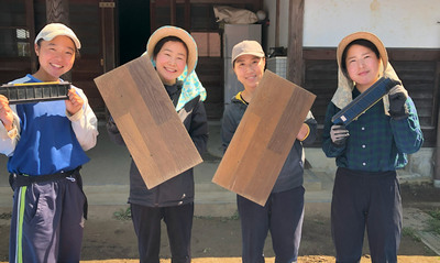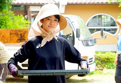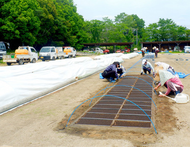 五月十三日、あゆちゃんたち八人のメンバーで育苗トレーに焼土を詰める作業をしました。今年は、約千枚の育苗トレーに焼土を詰めます。