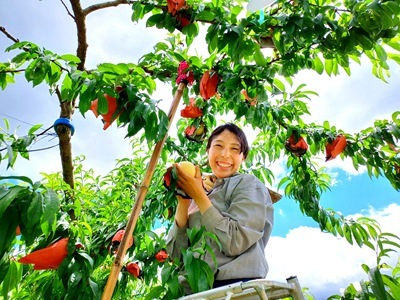 加納岩白桃は、二重袋をつけています。袋を少し開いたとき、ふわっと甘い香りを強く感じる実は熟れている実が多いです。桃の肌の色や桃が放つオーラを感じながら、収獲するべき実を見極めていきます。