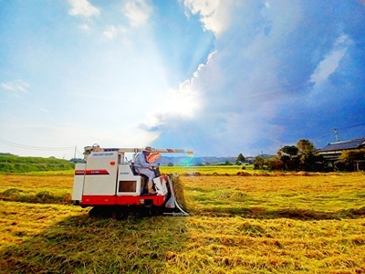 コンバインにブルーシートをかけていると、雨が落ち始めました。途中、空が暗くなったり雷が鳴っていたので、天気ももってくれて、無事に刈り終えられて嬉しかったです。
