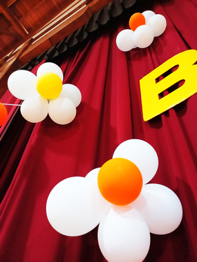 ステージの『HAPPY BIRTHDAY』の文字に、そこから左右へお花型にかたどった風船からバルーンアーチが伸びて、床には大小さまざまの黄金色の風船がごろごろと。