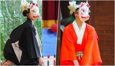 ステージには2匹の白狐。神社の鳥居の前にいるような白狐が着物をきて佇んでいる姿は本当に神社に来たかのようで、何だか物語が始まりだしそう。