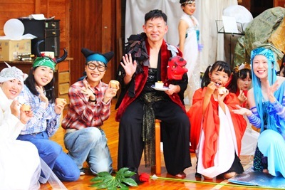 そこにいたのは、こちらも役者のひろちゃん演じる、神主に扮した妖怪と、仮面を身体全身に身につけた奇妙な2人や、両手を開くと大きな目が開かれる、黒づくめの長身2人など妖怪たちがいっぱい。